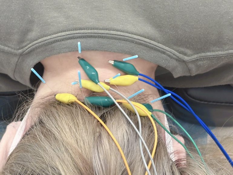 電気鍼は、刺した鍼に微弱な電流を流す治療法です。 これがストレートネックには特に効果的な理由は次の通り 1. 深層筋までしっかりアプローチ 首の深い部分(深頚筋など)は通常のマッサージでは届きにくいですが、 電気刺激を使うことで筋肉が“自然な収縮”を起こし、奥まで緩みます。 2. 血流と代謝を高め、修復を促進 電気刺激でポンプのように血流が活性化し、筋肉や神経の回復力が上がります。 3. 持続的な効果が得やすい 通常の鍼よりも筋緊張の改善が長持ちしやすく、施術後の軽さが続きやすいのが特徴です。